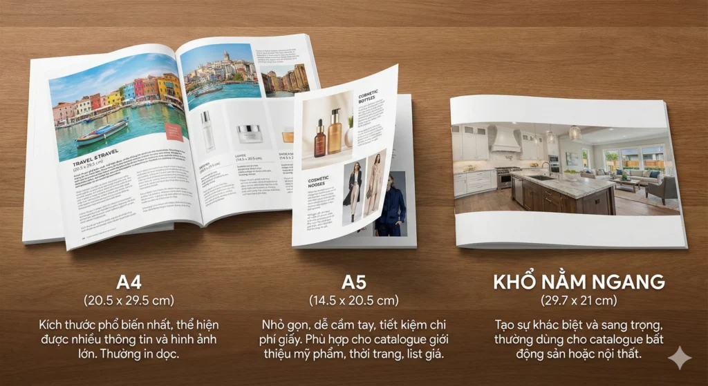 A5 (14.5 x 20.5 cm): Nhỏ gọn, dễ cầm tay, tiết kiệm chi phí giấy. Phù hợp cho catalogue giới thiệu mỹ phẩm, thời trang, list giá.