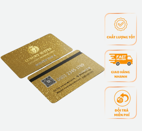 | 100 cái | PVC 4 lớp, In 4 màu, Lớp phủ nhũ Vàng/Bạc | Cắt thành phẩm, Bo góc tiêu chuẩn | 15.000 – 25.000 |