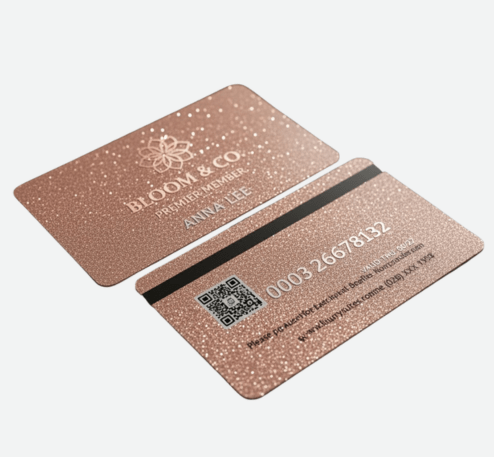 Thẻ Nhựa Ánh Nhũ (Glitter/Shimmer Card) là loại thẻ cao cấp, được bổ sung các hạt kim tuyến siêu nhỏ hoặc lớp phủ nhũ đặc biệt trong quá trình sản xuất. Khi ánh sáng chiếu vào, thẻ sẽ tạo ra hiệu ứng lấp lánh, thu hút sự chú ý ngay lập tức.