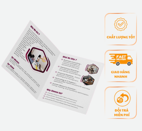 | Tạo Tính Chuyên Nghiệp | Hình thức gấp 2 tạo nên một “cuốn sách” nhỏ, thể hiện sự đầu tư và tôn trọng thông tin. | Sử dụng làm cẩm nang hướng dẫn sử dụng cơ bản. |